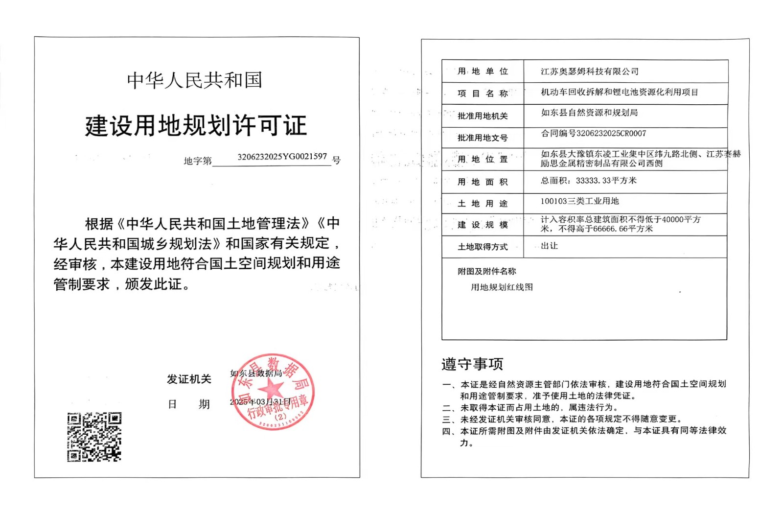 机动车回收拆解和锂电池资源化利用项目建设用地规划许可证批后公布