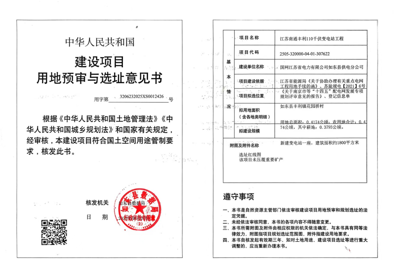 江苏南通丰利110千伏变电站工程用地预审与选址意见书批后公布