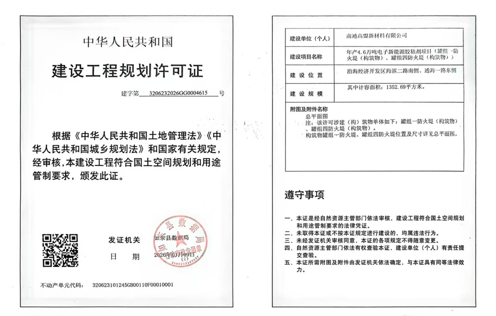 年产4.6万吨电子新能源胶粘剂项目(罐组一防火堤(构筑物)、罐组四防火堤(构筑物))建设工程规划许可证批后公布