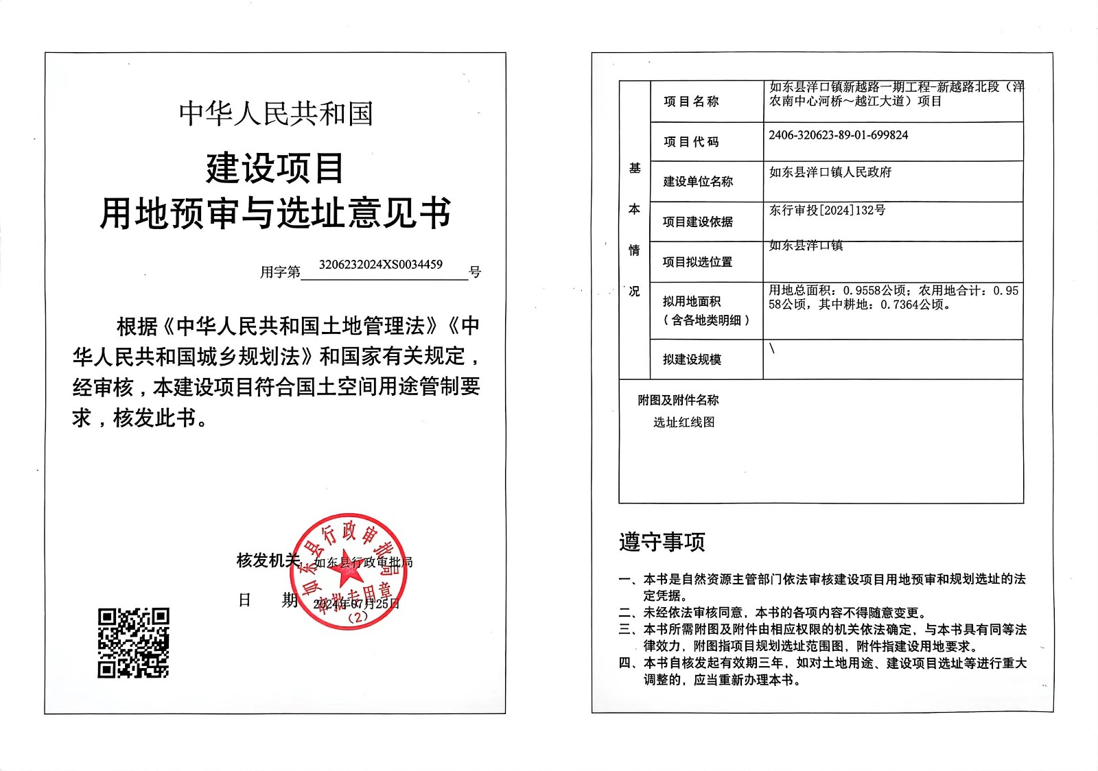 如东县洋口镇新越路一期工程-新越路北段(洋农南中心河桥~越江大道)项目用地预审与选址意见书批后公布