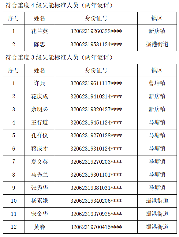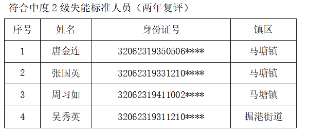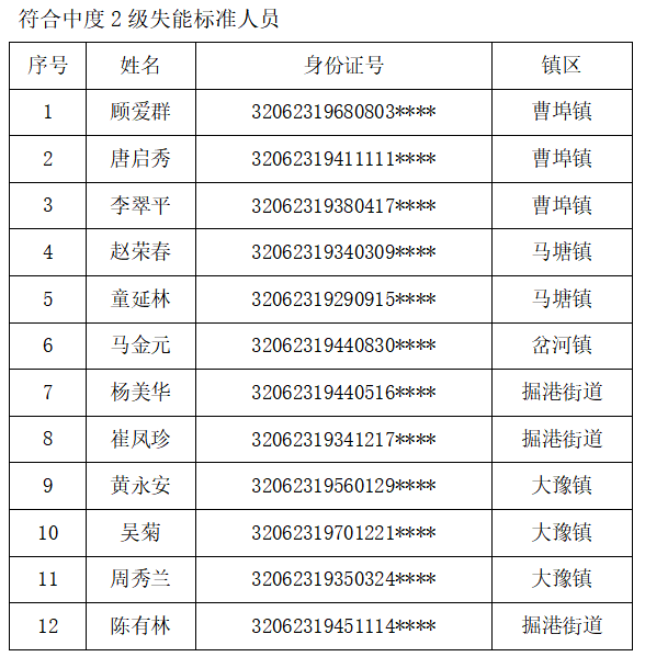 根据《市政府印发〈关于建立基本照护保险制度的意见(试行)〉的通知》(通政发〔2015〕73号)及《县政府关于印发〈如东县长期照护保险实施办法(试行)〉的通知》(东政发〔2019〕27)号精神,按照《国家医保局办公室民政部办公厅关于印发〈长期护理失能等级评估标准(试行)>的通知》(医保办〔2021〕37 号)、《国家医保局办公室关于印发〈长期护理保险失能等级评估操作指南(试行)>的通知》(医保办〔2022〕1号)规定的标准,经如东县长期照护保险失能评定专家组评定,陈玉娟等2位参保人员符合如东县长期照护保险参保人员重度5级失能标准,刘锦佑等5位参保人员符合如东县长期照护保险参保人员重度4级失能标准,杨玉芳等16位参保人员符合如东县长期照护保险参保人员重度3级失能标准,顾爱群等16位参保人员符合如东县长期照护保险参保人员中度2级失能标准,现予公示。公示时间2026年3月23日至2026年3月29日。如有异议,请在公示期内与如东县医疗保障局(泰山路16号)社会保险大楼一楼43号窗口联系。