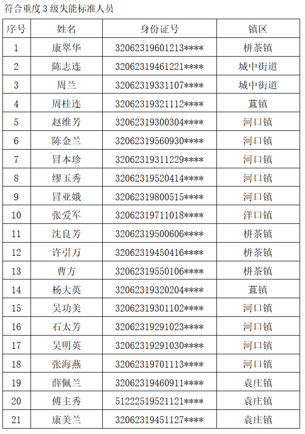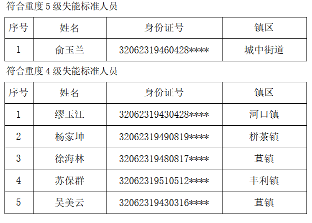 根据《市政府印发〈关于建立基本照护保险制度的意见(试行)〉的通知》(通政发〔2015〕73号)及《县政府关于印发〈如东县长期照护保险实施办法(试行)〉的通知》(东政发〔2019〕27)号精神,按照《国家医保局办公室民政部办公厅关于印发〈长期护理失能等级评估标准(试行)>的通知》(医保办〔2021〕37 号)、《国家医保局办公室关于印发〈长期护理保险失能等级评估操作指南(试行)>的通知》(医保办〔2022〕1号)规定的标准,经如东县长期照护保险失能评定专家组评定,俞玉兰1位参保人员符合如东县长期照护保险参保人员重度5级失能标准,缪玉江等5位参保人员符合如东县长期照护保险参保人员重度4级失能标准,康翠华等21位参保人员符合如东县长期照护保险参保人员重度3级失能标准,徐守贵等13位参保人员符合如东县长期照护保险参保人员中度2级失能标准,现予公示。公示时间2026年2月2日至2026年2月8日。如有异议,请在公示期内与如东县医疗保障局(泰山路16号)社会保险大楼一楼43号窗口联系。