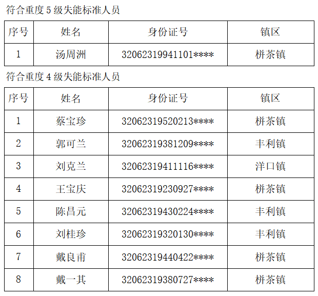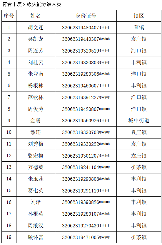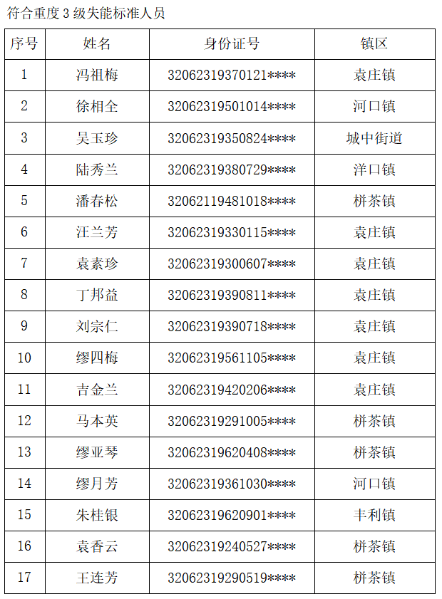 根据《市政府印发〈关于建立基本照护保险制度的意见(试行)〉的通知》(通政发〔2015〕73号)及《县政府关于印发〈如东县长期照护保险实施办法(试行)〉的通知》(东政发〔2019〕27)号精神,按照《国家医保局办公室民政部办公厅关于印发〈长期护理失能等级评估标准(试行)>的通知》(医保办〔2021〕37 号)、《国家医保局办公室关于印发〈长期护理保险失能等级评估操作指南(试行)>的通知》(医保办〔2022〕1号)规定的标准,经如东县长期照护保险失能评定专家组评定,汤周洲1位参保人员符合如东县长期照护保险参保人员重度5级失能标准,蔡宝珍等8位参保人员符合如东县长期照护保险参保人员重度4级失能标准,冯祖梅等17位参保人员符合如东县长期照护保险参保人员重度3级失能标准,胡文连等19位参保人员符合如东县长期照护保险参保人员中度2级失能标准,现予公示。公示时间2026年2月9日至2026年2月15日。如有异议,请在公示期内与如东县医疗保障局(泰山路16号)社会保险大楼一楼43号窗口联系。