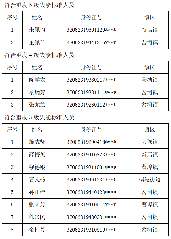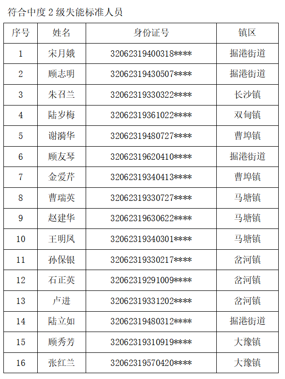 根据《市政府印发〈关于建立基本照护保险制度的意见(试行)〉的通知》(通政发〔2015〕73号)及《县政府关于印发〈如东县长期照护保险实施办法(试行)〉的通知》(东政发〔2019〕27)号精神,按照《国家医保局办公室民政部办公厅关于印发〈长期护理失能等级评估标准(试行)>的通知》(医保办〔2021〕37 号)、《国家医保局办公室关于印发〈长期护理保险失能等级评估操作指南(试行)>的通知》(医保办〔2022〕1号)规定的标准,经如东县长期照护保险失能评定专家组评定,朱佩均等2位参保人员符合如东县长期照护保险参保人员重度5级失能标准,陈学太等3位参保人员符合如东县长期照护保险参保人员重度4级失能标准,施成贤等8位参保人员符合如东县长期照护保险参保人员重度3级失能标准,宋月娥等16位参保人员符合如东县长期照护保险参保人员中度2级失能标准,现予公示。公示时间2026年3月2日至2026年3月8日。如有异议,请在公示期内与如东县医疗保障局(泰山路16号)社会保险大楼一楼43号窗口联系。