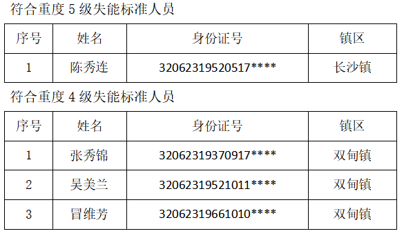 根据《市政府印发〈关于建立基本照护保险制度的意见(试行)〉的通知》(通政发〔2015〕73号)及《县政府关于印发〈如东县长期照护保险实施办法(试行)〉的通知》(东政发〔2019〕27)号精神,按照《国家医保局办公室民政部办公厅关于印发〈长期护理失能等级评估标准(试行)>的通知》(医保办〔2021〕37 号)、《国家医保局办公室关于印发〈长期护理保险失能等级评估操作指南(试行)>的通知》(医保办〔2022〕1号)规定的标准,经如东县长期照护保险失能评定专家组评定,陈秀连1位参保人员符合如东县长期照护保险参保人员重度5级失能标准,张秀锦等3位参保人员符合如东县长期照护保险参保人员重度4级失能标准,陈祥贵等12位参保人员符合如东县长期照护保险参保人员重度3级失能标准,赵尊华等12位参保人员符合如东县长期照护保险参保人员中度2级失能标准,现予公示。公示时间2026年2月2日至2026年2月8日。如有异议,请在公示期内与如东县医疗保障局(泰山路16号)社会保险大楼一楼43号窗口联系。