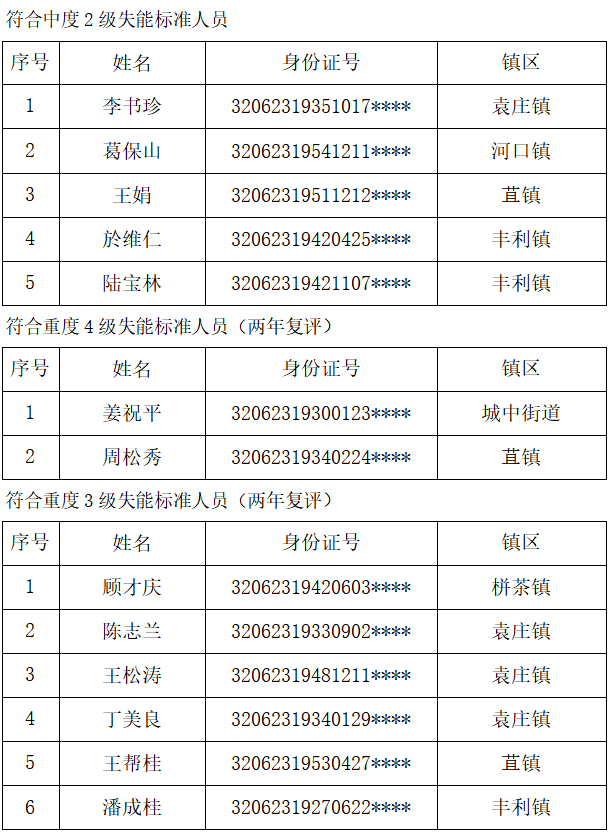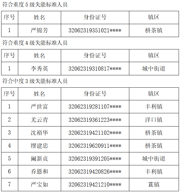 根据《市政府印发〈关于建立基本照护保险制度的意见(试行)〉的通知》(通政发〔2015〕73号)及《县政府关于印发〈如东县长期照护保险实施办法(试行)〉的通知》(东政发〔2019〕27)号精神,按照《国家医保局办公室民政部办公厅关于印发〈长期护理失能等级评估标准(试行)>的通知》(医保办〔2021〕37 号)、《国家医保局办公室关于印发〈长期护理保险失能等级评估操作指南(试行)>的通知》(医保办〔2022〕1号)规定的标准,经如东县长期照护保险失能评定专家组评定,严锦芳1位参保人员符合如东县长期照护保险参保人员重度5级失能标准,李秀英等3位参保人员符合如东县长期照护保险参保人员重度4级失能标准,严世富等13位参保人员符合如东县长期照护保险参保人员重度3级失能标准,李书珍等11位参保人员符合如东县长期照护保险参保人员中度2级失能标准,现予公示。公示时间2026年3月16日至2026年3月22日。如有异议,请在公示期内与如东县医疗保障局(泰山路16号)社会保险大楼一楼43号窗口联系。