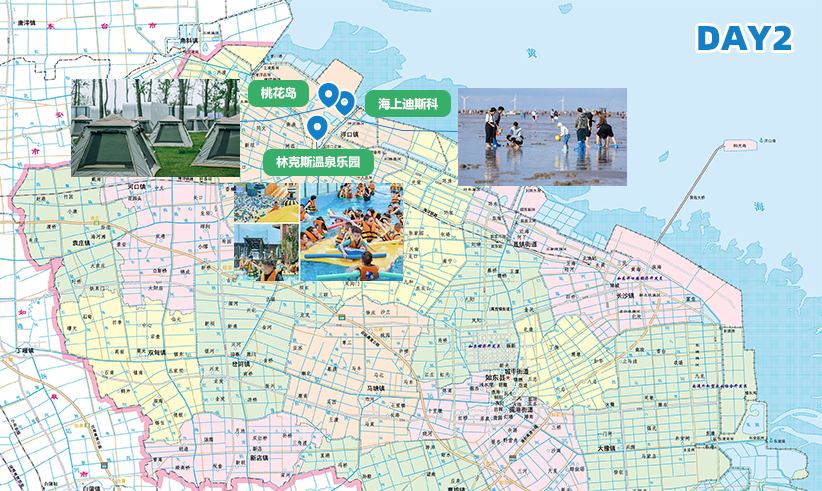 上午:栟茶早茶店早餐后赴小洋口滩涂赶海跳海上迪斯科、 温泉展示中心游览及温泉煮鸡蛋品尝; 中午:桃花岛露营海底捞或海鲜自助烧烤; 下午:林克斯温泉乐园、反清乡纪念馆AAAA红色景区游览; 晚上:洋口国家中心渔港品尝海鲜、采买海鲜产品返程。